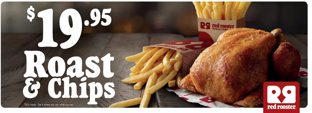$19.95 Roast & Chips Deal is available nationwide from 4–24 February, all day, in store or via Click & Collect through the Red Rooster app.