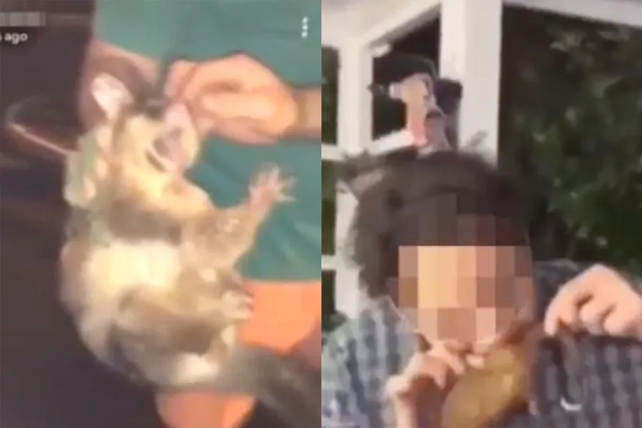 The most disturbing video shows a young man being encouraged by friends to bite chunks of fur and flesh out of the seemingly live possum’s rump with his teeth.